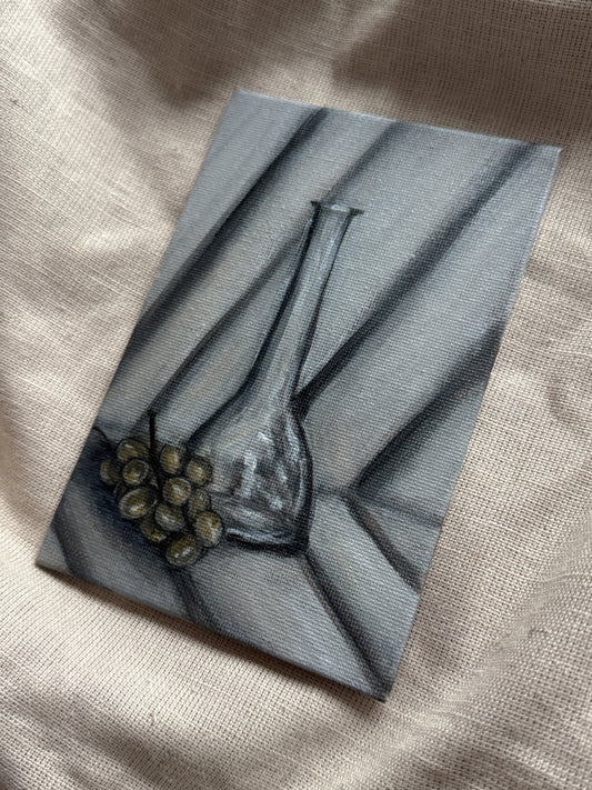 a glass bottle & grapes