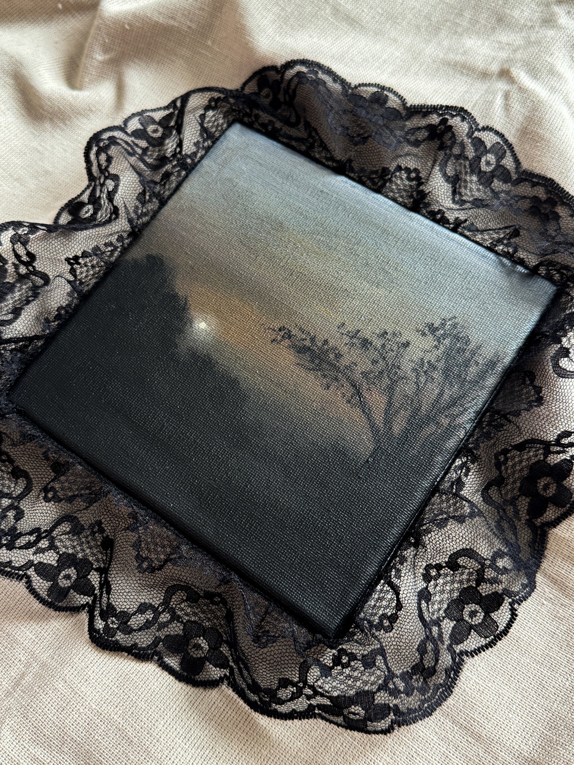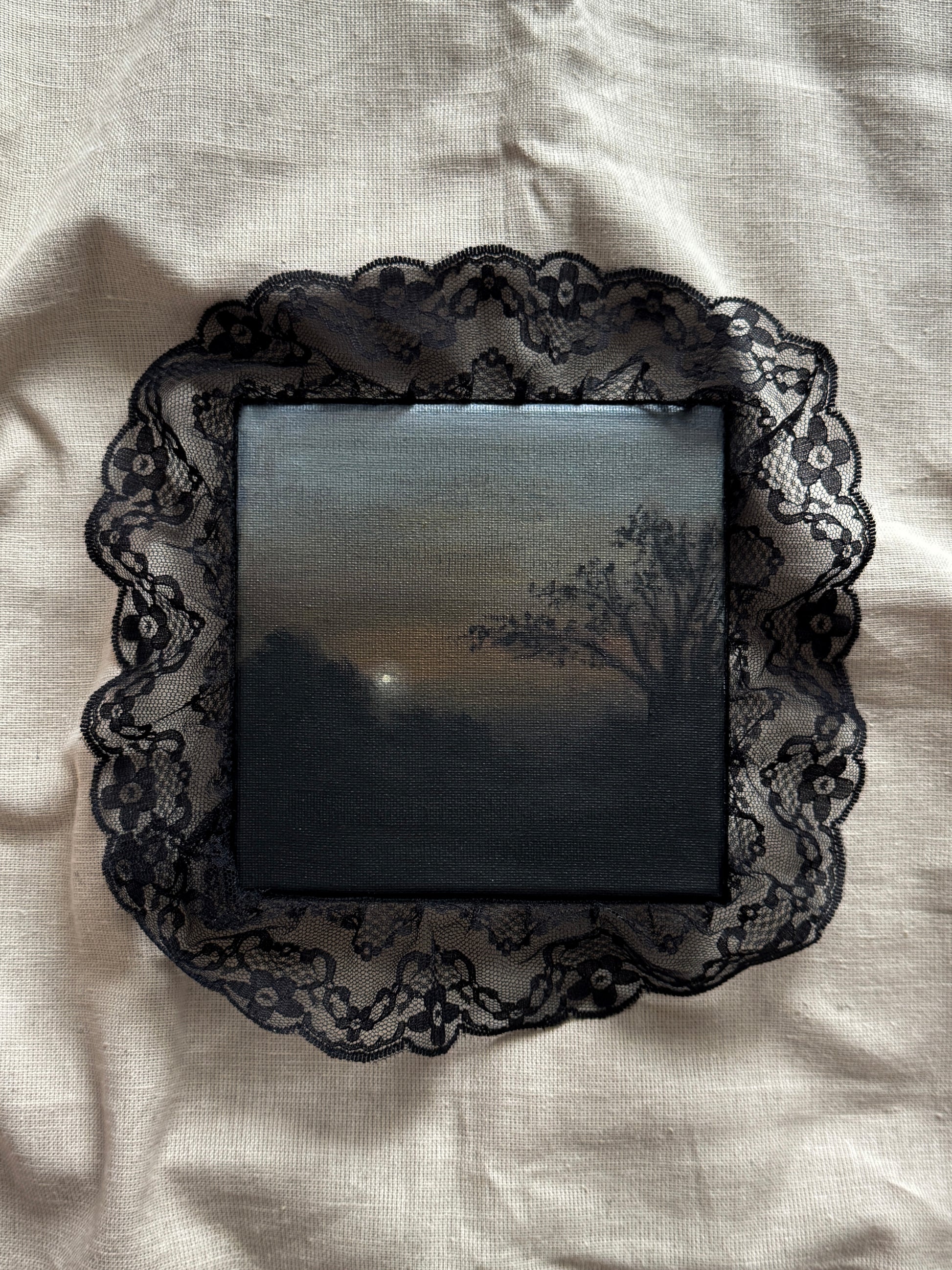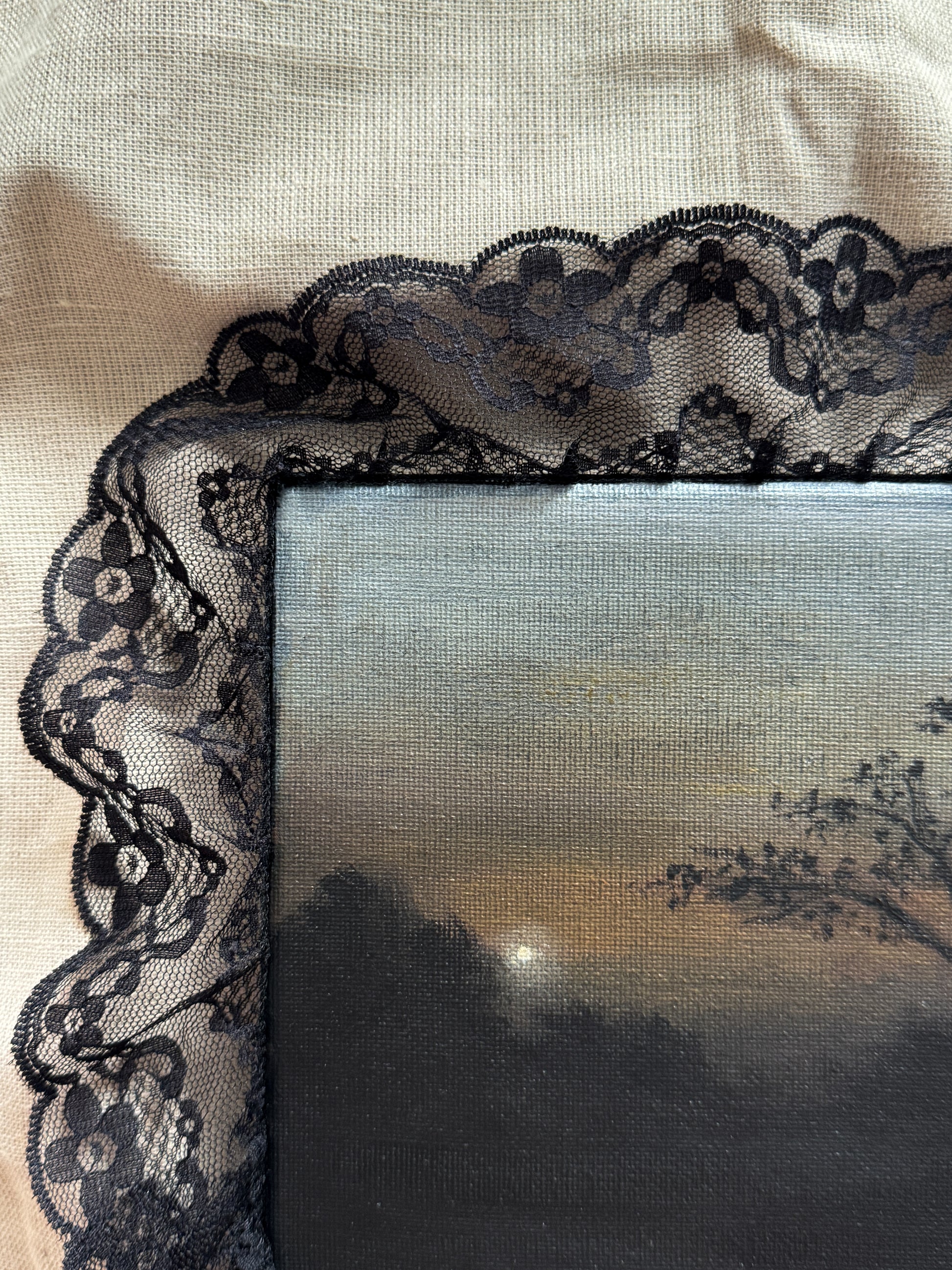 An original acrylic painting on canvas, with a lace border.